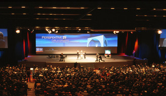 Electronic stage set design for the Wirtschaftstag 2000 of the Genossenschaftsverband der Volks- und Raiffeisenbanken